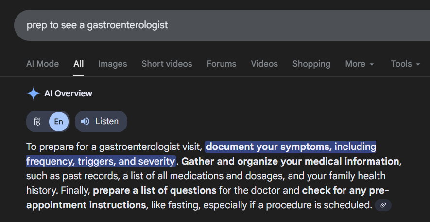 AI Overviews can compress answers above traditional organic results, especially for FAQs, symptoms, and “prep” questions.