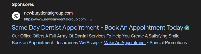 - Assets to add: Call asset (or call-only ads for urgent lines), location asset, structured snippets (Services, Insurance), sitelinks (New Patients, Insurance, Locations, Book Now), price assets where allowed.